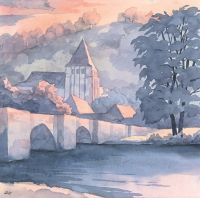 Das letzte Aquarell unserer Versteigerung führt uns nach Frankreich zurück. Der Innsbrucker Dr. Altbischof Reinhold Stecher interessierte sich sehr für mittelalterliche Ortschaften und Städte mit ihren Klosteranlagen und religiösen Stätten. Die Gemeinde Moutier-d?Ahun mit der gleichnamigen Abtei liegt im Kanton Ahun. Dargestellt ist auch die romanische Brücke über die Creuse.