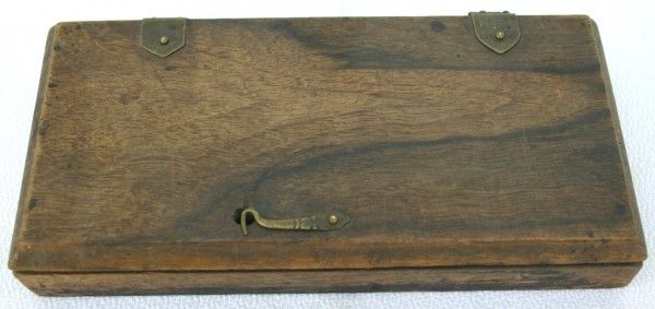 Nußholzgehäuse mit Messingscharnieren, 12 Gewichte, 1 Lade mit Messingdeckel für ganz kleine Ausgleichsgewichte (2 Stück)