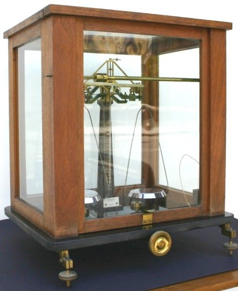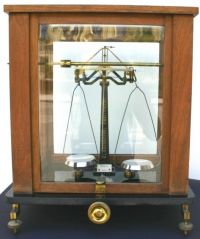 Eisengußstandfuß auf schwarzer Glasbasis mit zwei Stellschrauben, Feststellmechanismus seitliche Gewichtskorregierstange, absenkbare Schalenfixierung