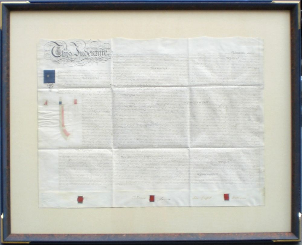 Handschrift mit koloriertem Grundriss, mehreren Prägesiegel und Unterschriften, sehr aufwändige Rahmung mit Sichtfenster rückseitig