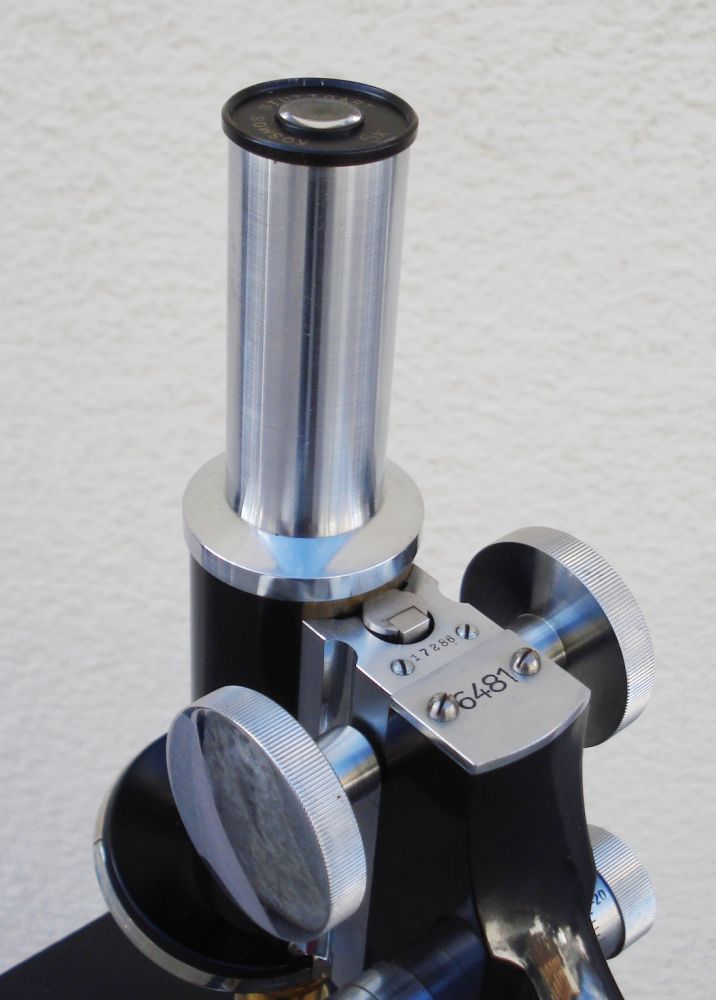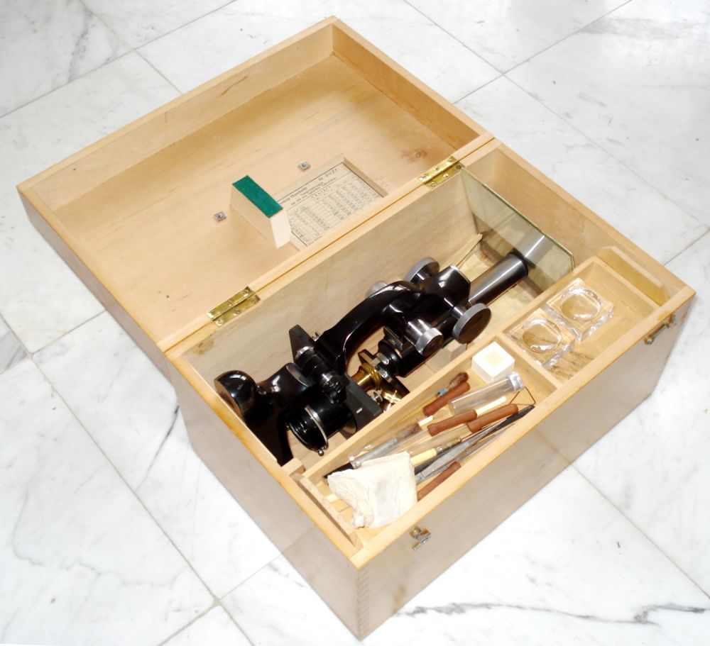 Mikroskop mit Hufeisenstativ, schwarz lackiert und 2 wechselbare Tuben; im originalen Holzkasten mit allerlei Zubehör (s. Foto)