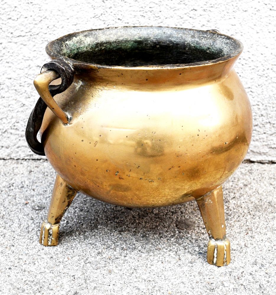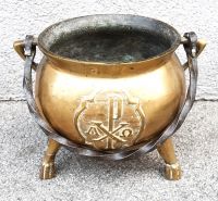 Dreifußkochtopf aus Messing/Bronze mit Eisenhenkel, drei Standbeine, PAX-Symbol als Relief vorne