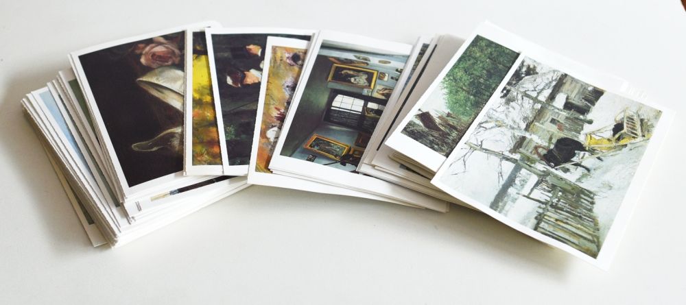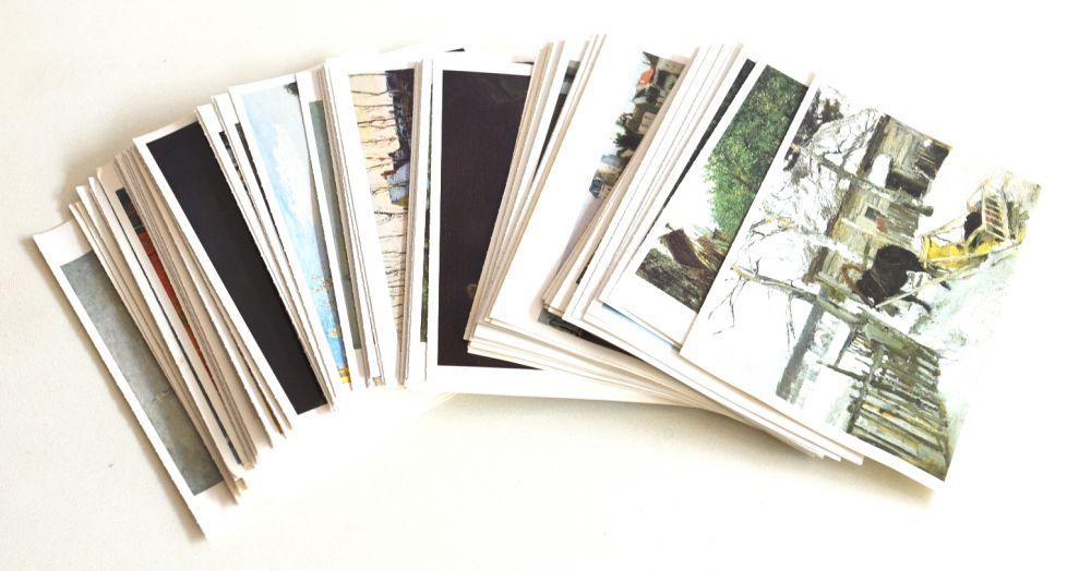 90 Kunst-Postkarten, alle leicht gewellt (wg. Feuchtigkeit, teilweise fleckig)
