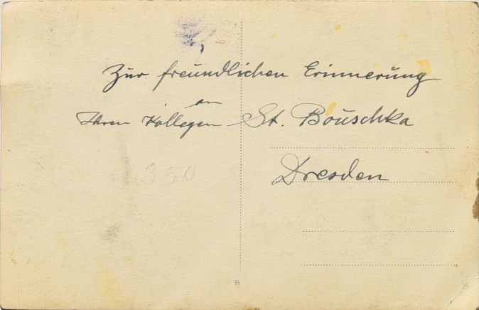 rückseitig handschriftliche Widmung: Zur freundlichen Erinnerung an Ihren Kollegen St. Bouschka. Dresden