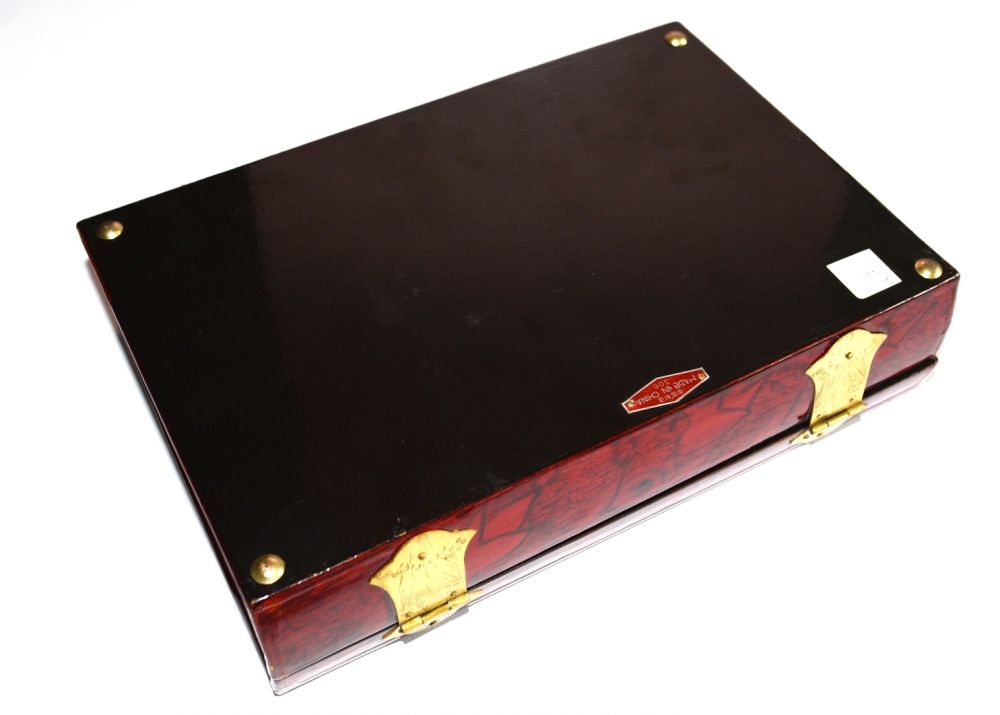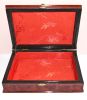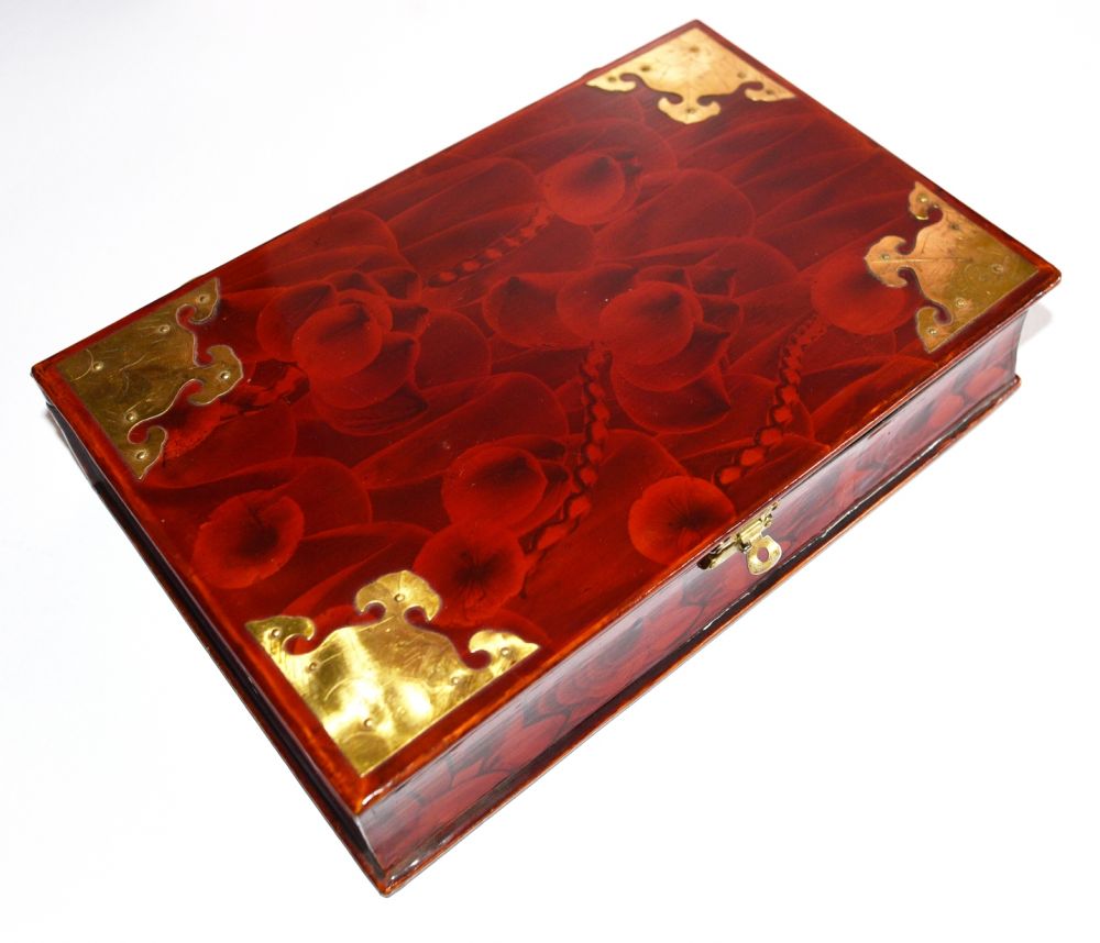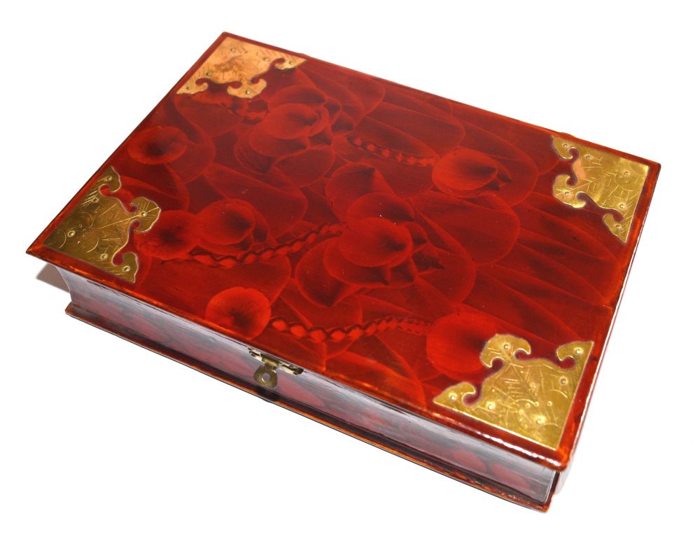 rote, lackierte Schatulle; sämtliche Beschläge aus Messing, innen mit rotem Samt bezogen, 4 kleine halbrunde Füße; 2 kleine Messingnägel beim Scharnier fehlen
