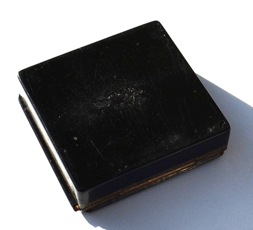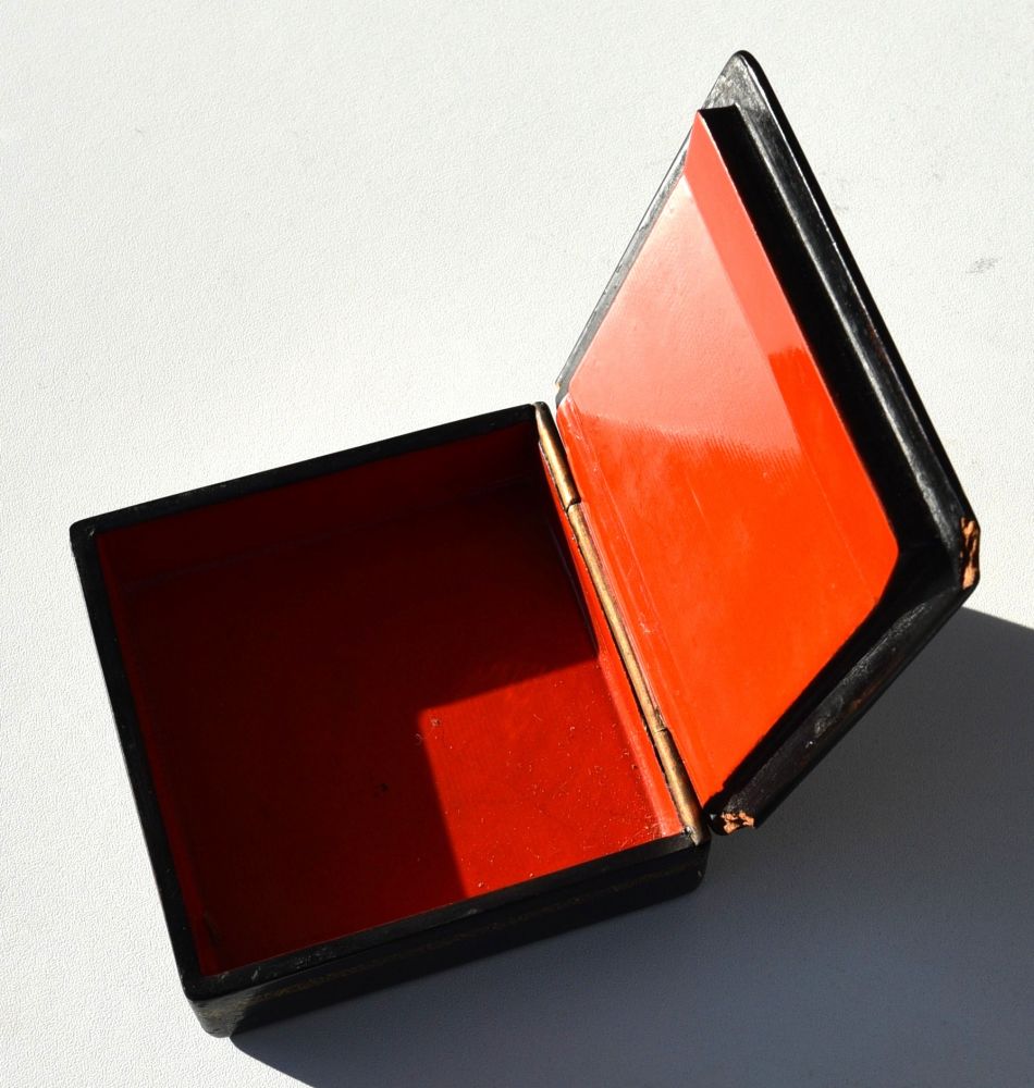 Lackdose mit filigraner Deckelmalerei / Handmalerei, Innsenseite im starken Rotton, Messingscharnier, Ecken leicht bestoßen (Altersspuren s. Fotos)