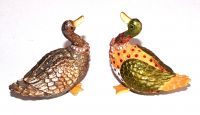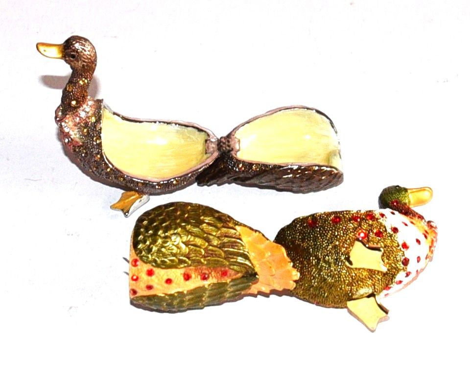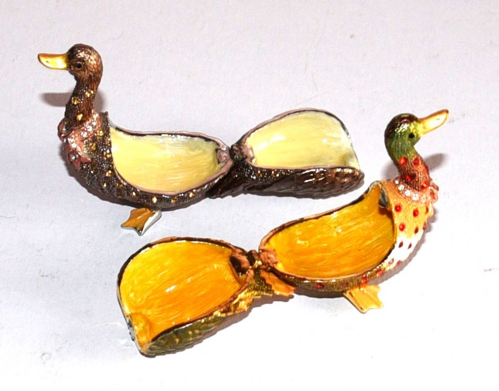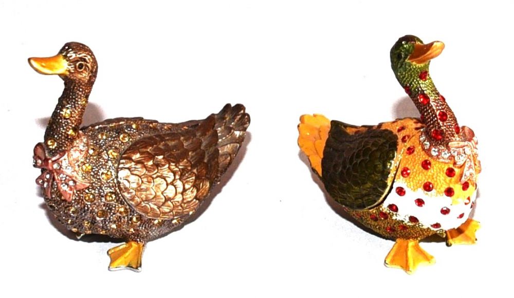 Enten mit aufgeklebten Swarovski-Glasperlen als Schmuckdosen, sämtliche Oberflächen sind emailliert
