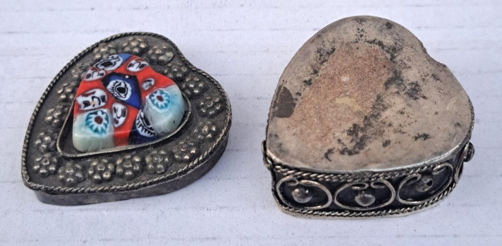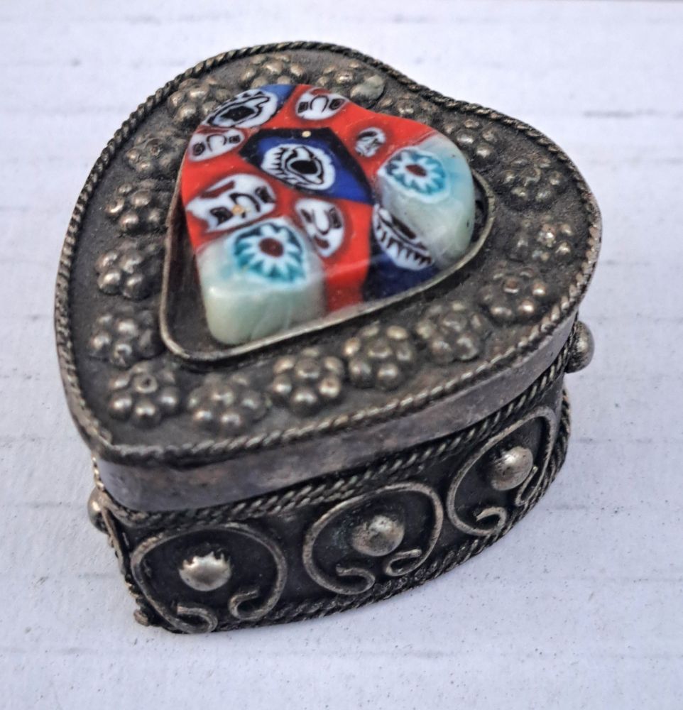kleine Blechdose mit Unterteil und Deckel, liebliche gestaltet mit floralen Ornamenten, aufgeklebtes Glasherz (Smalti)