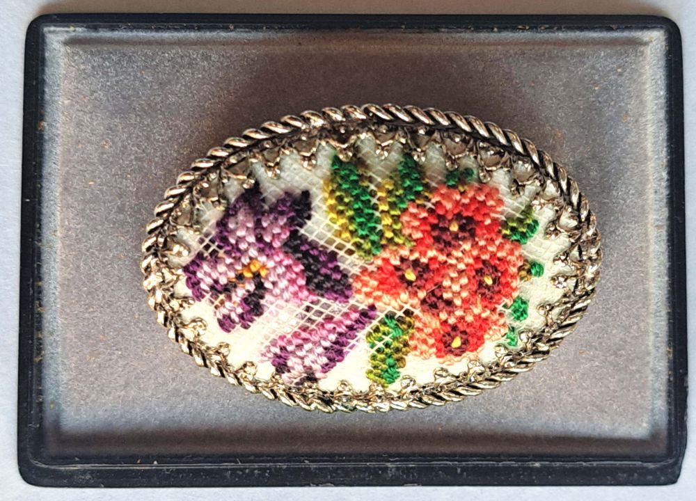 neuwertige ovale Stickbrosche im originalen Etui