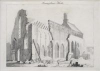 Die Franziskaner Kirche wurde 1803 zerstört. Die Druckgraphik zeigt die Zerstörung und stammt aus: Anton Baumgarten, Polizeiübersicht von München 1805 mit 52 Kupfern von Bollinger.